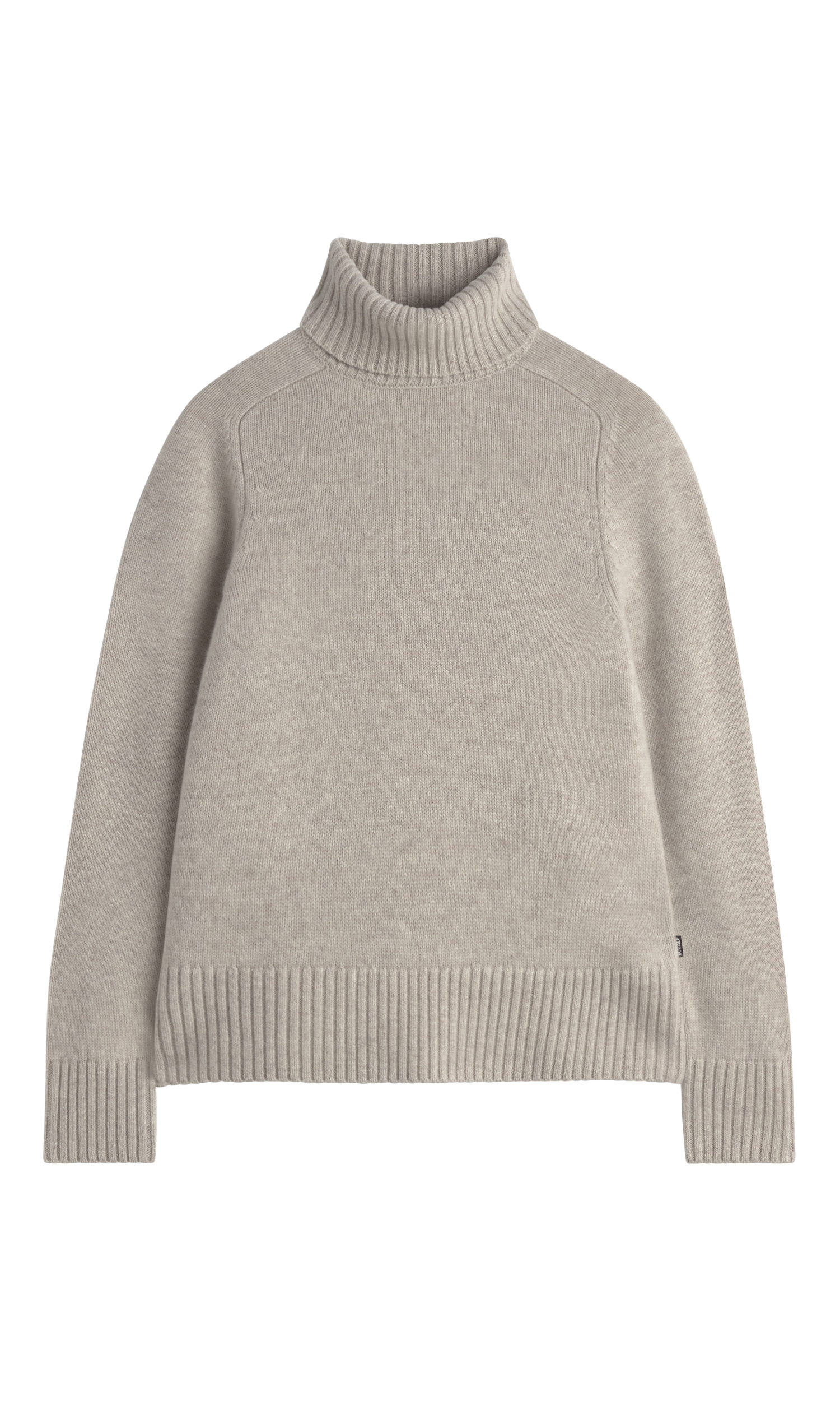 100% 리사이클 울의 스탠드 칼라 니트. 보온성과 절제된 선을 동시에.