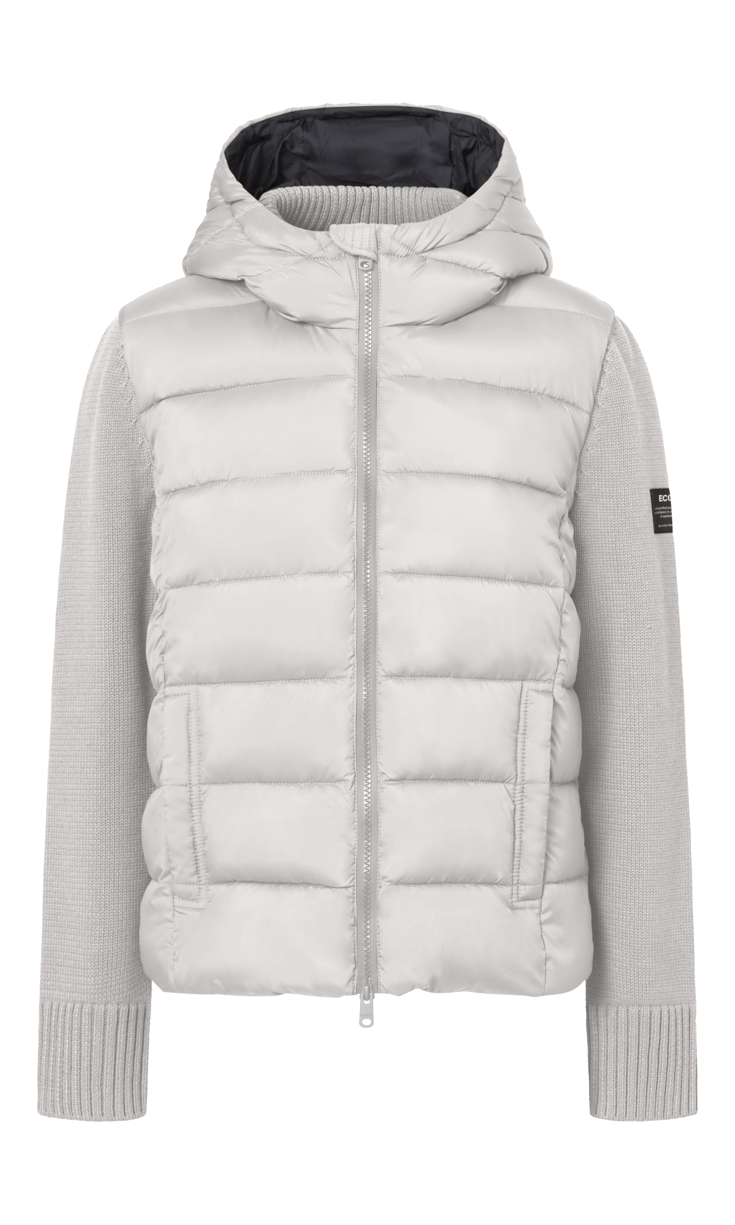 리사이클 폴리에스터와 유기농 면을 적재적소에 배치한 하이브리드 재킷. 몸판의 보온과 소매의 부드러움을 균형 있게 담았습니다.