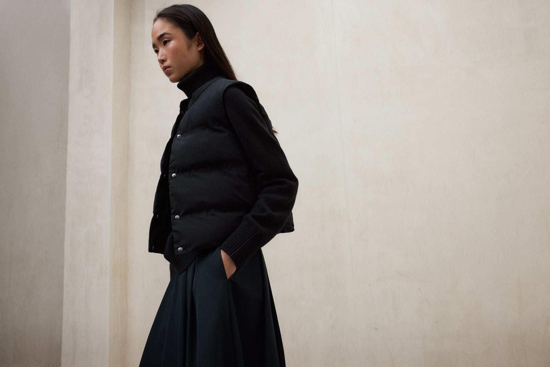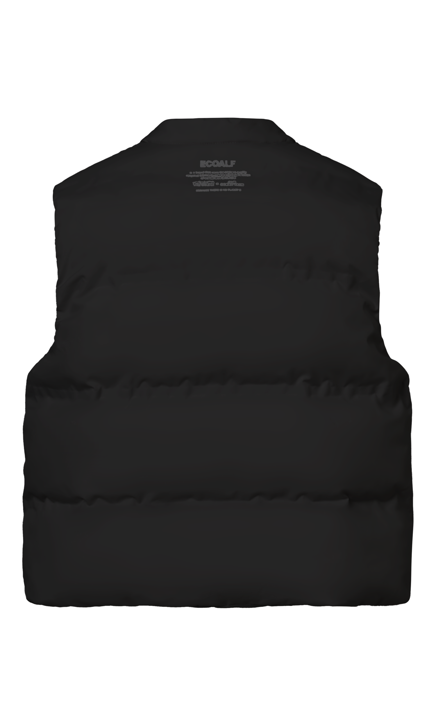 Tex2Tex 57%와 오션 얀 43%의 리사이클 폴리. 비 오는 날에도 따뜻하고 건조하게 지켜주는 경량 베스트입니다.