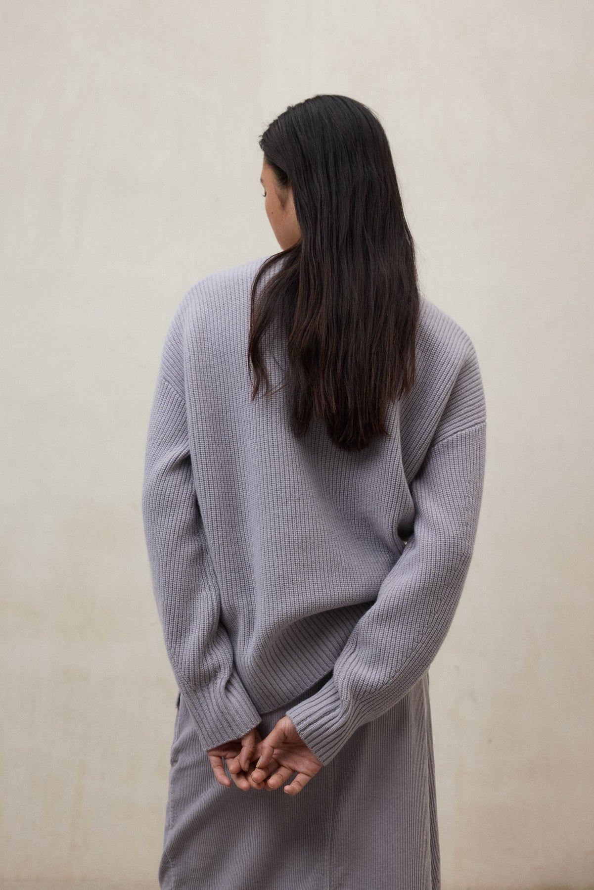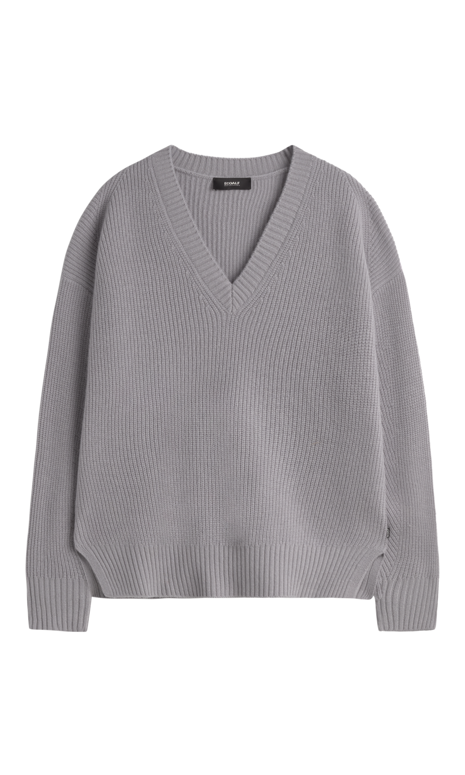 100% 리사이클 울의 클래식 V넥 니트. 립 디테일로 완성한 담백한 실루엣이 활용도를 높입니다.
