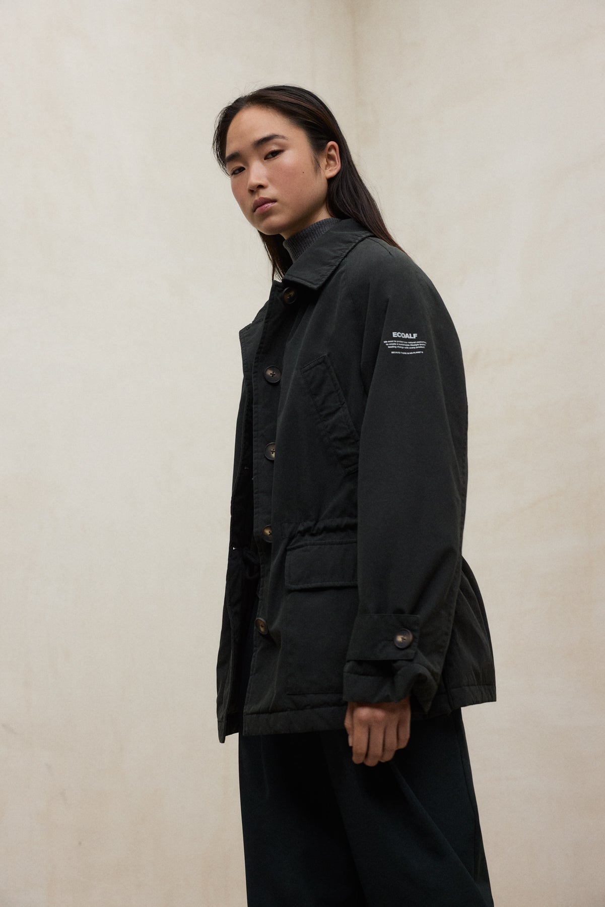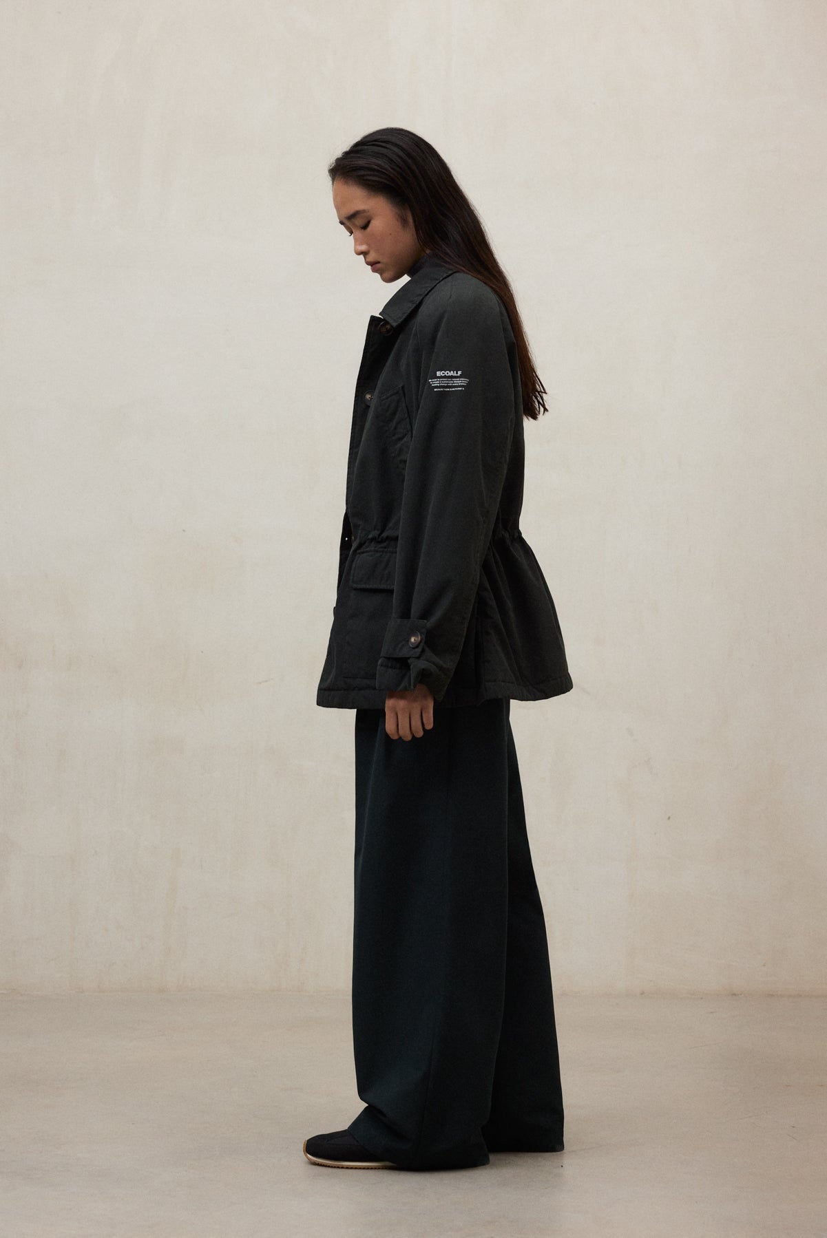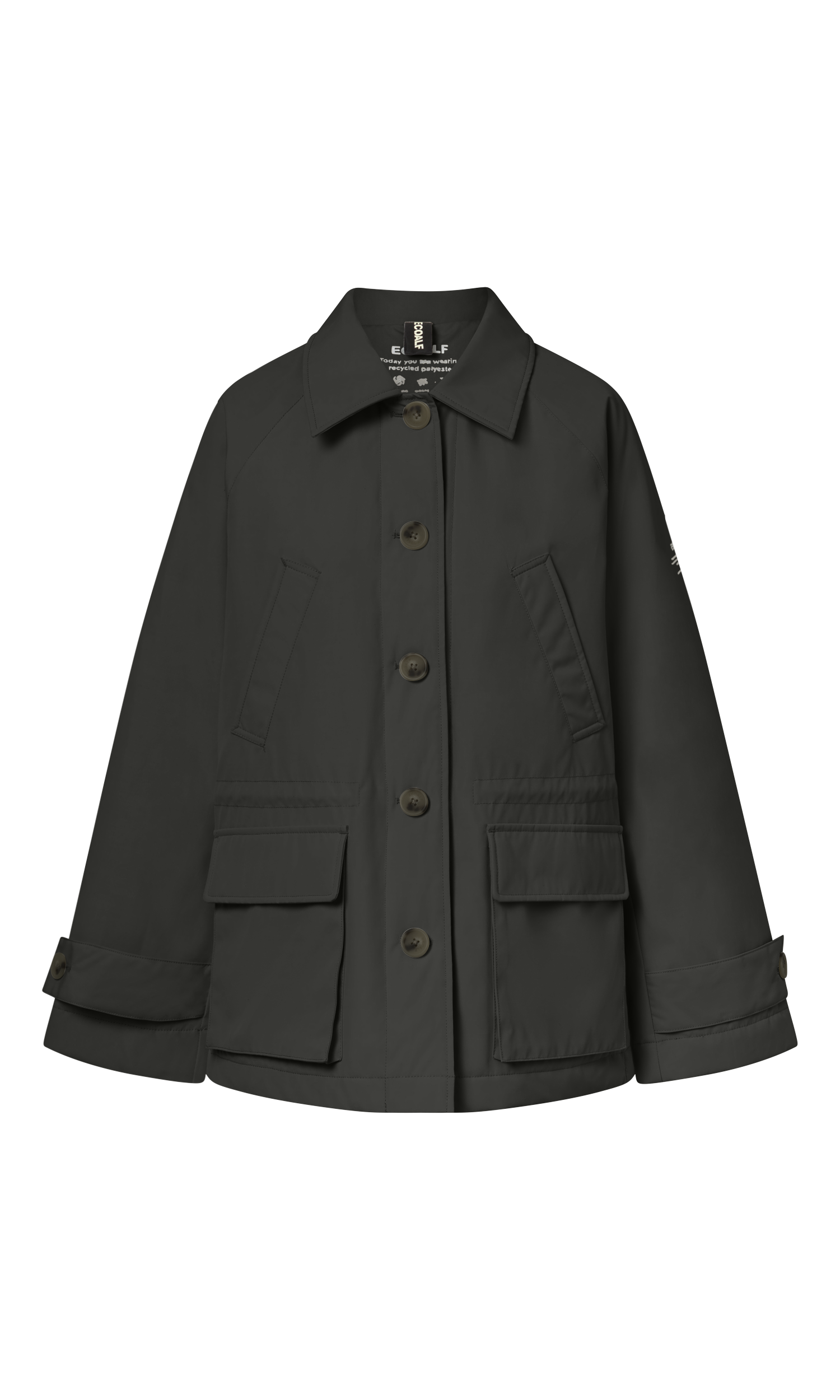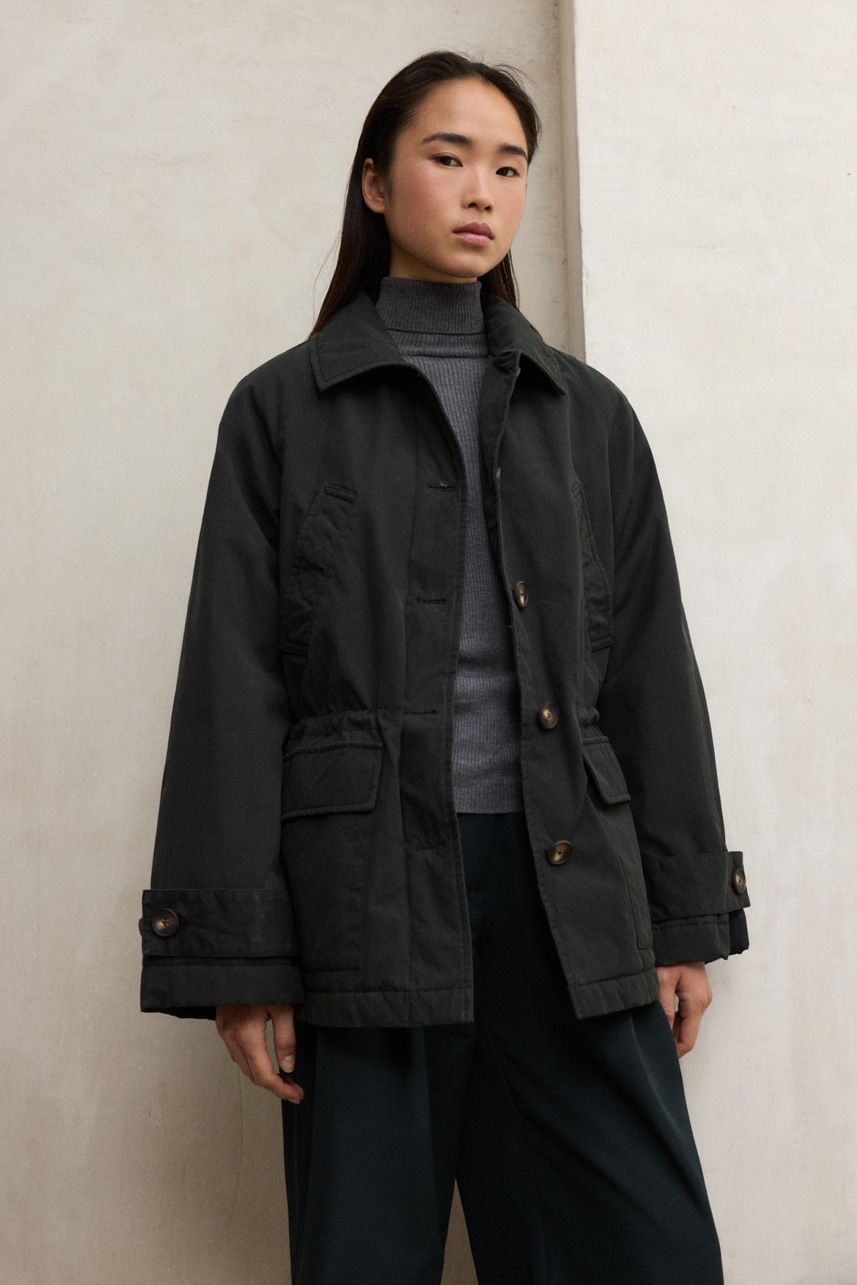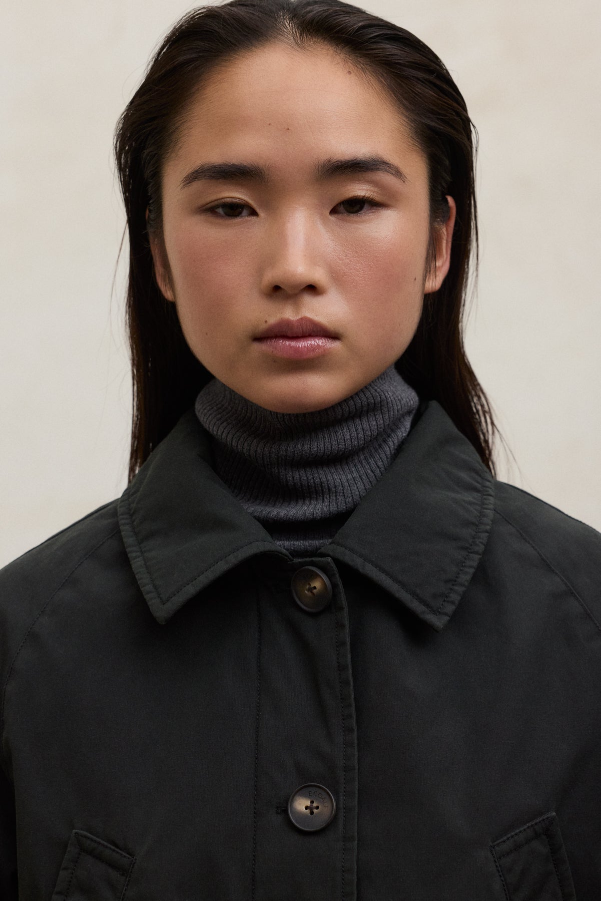리사이클 폴리 54%와 유기면 46%의 발수 코트. 실용성과 세련된 비례로 도시와 야외를 자연스럽게 잇습니다.