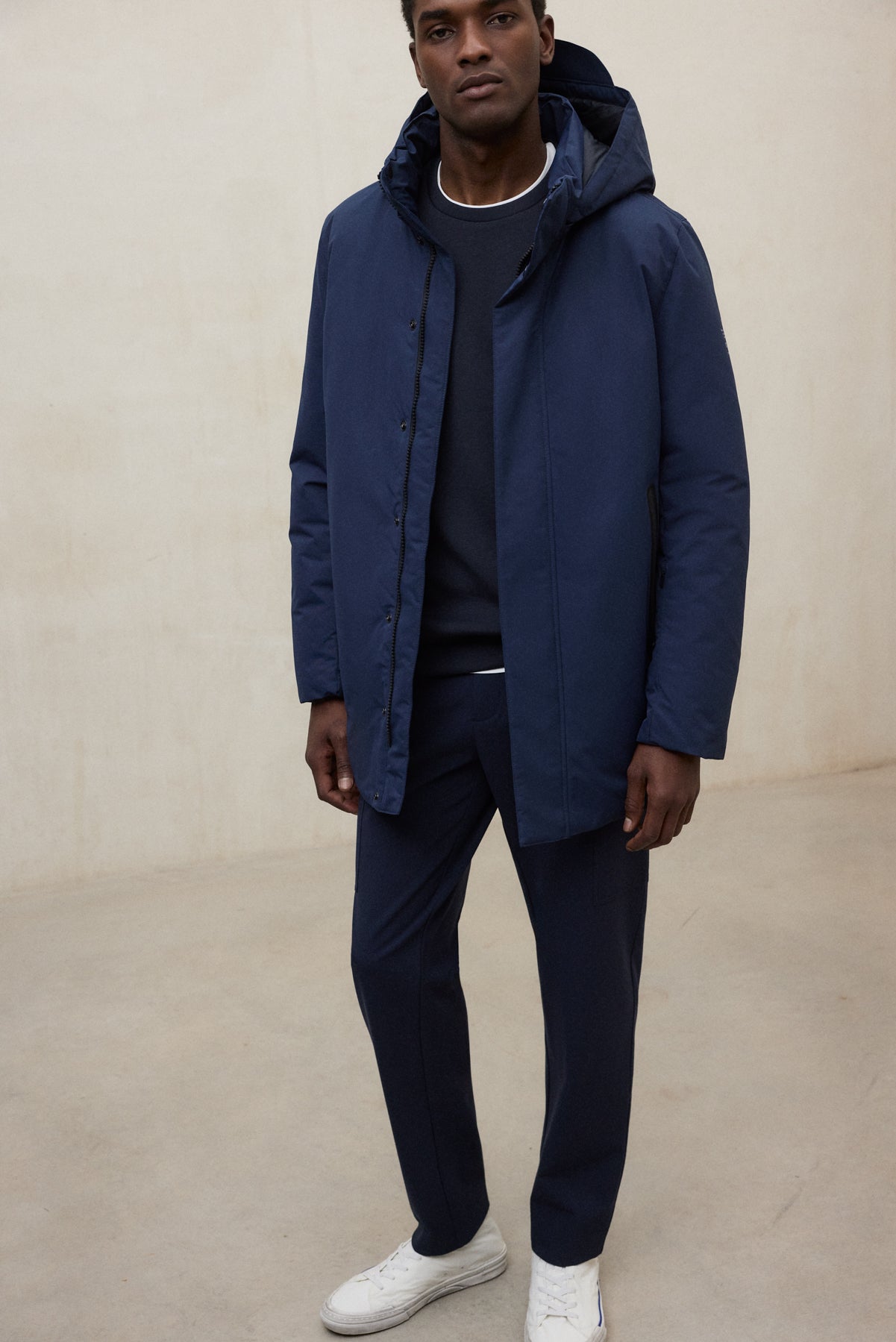오션 얀과 Tex2Tex의 안정적 보온 코트. 한겨울 비와 추위를 차분히 다루는 실용미가 돋보입니다.